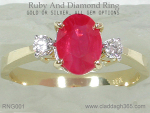 A stunning ruby diamond gemstone ring with a natural ruby gemstone and a sparkling diamond on either side of the ruby. This is one gemstone that has impressed jewelry and gem lovers for thousands of years. Always a rare gem and never cheap, rubies were once the privilege of royals and statesmen. When the British went on a colonizing spree, they gathered some fine red gems presuming that they were rubies and presented them to the Royal Crown collection back home. In their desperate effort to please the palace, they unfortunately treasured some red spinel gems mistaking them for ruby! Probably to save face, the gems continue to go by their original names that tagged them as 'rubies'. The design concept for this ruby diamond ring is suitable for both formal and casual occasions, it happens to be one of the best selling designs for an engagement ring. You can request for this gorgeous ruby ring to be crafted in gold or sterling silver, the gold ring has options for yellow, white or rose gold. We got full details for this amazing gemstone and diamond ring here.